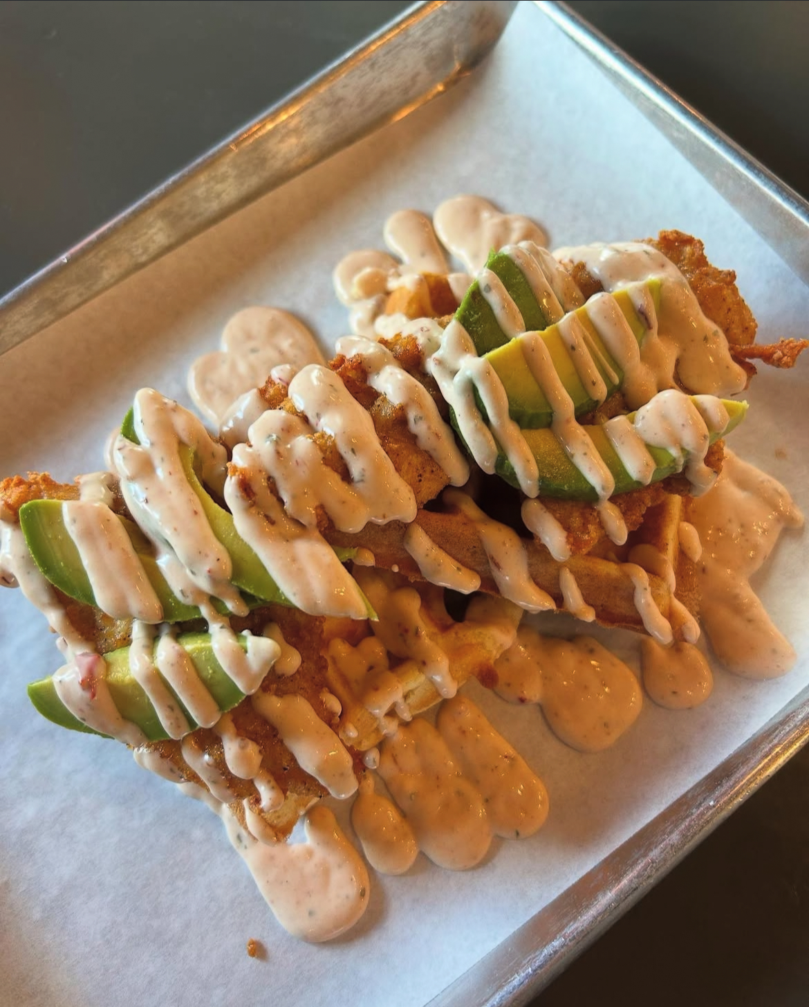 Chicken, Avocado, & Ranch Chicken, Avocado, & Ranch A rich cornbread waffle topped with crispy chicken, fresh avocado slices, and doused in our house chipotle ranch!