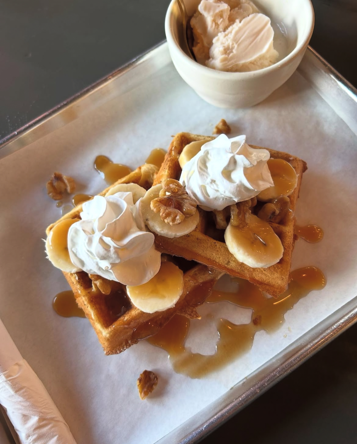 Bananas Foster Bananas Foster A fluffy sweet cream waffle topped with banana slices, walnuts, hot caramel, and brown sugar syrup! This classic is completed with whipped cream and a side of ice cream!