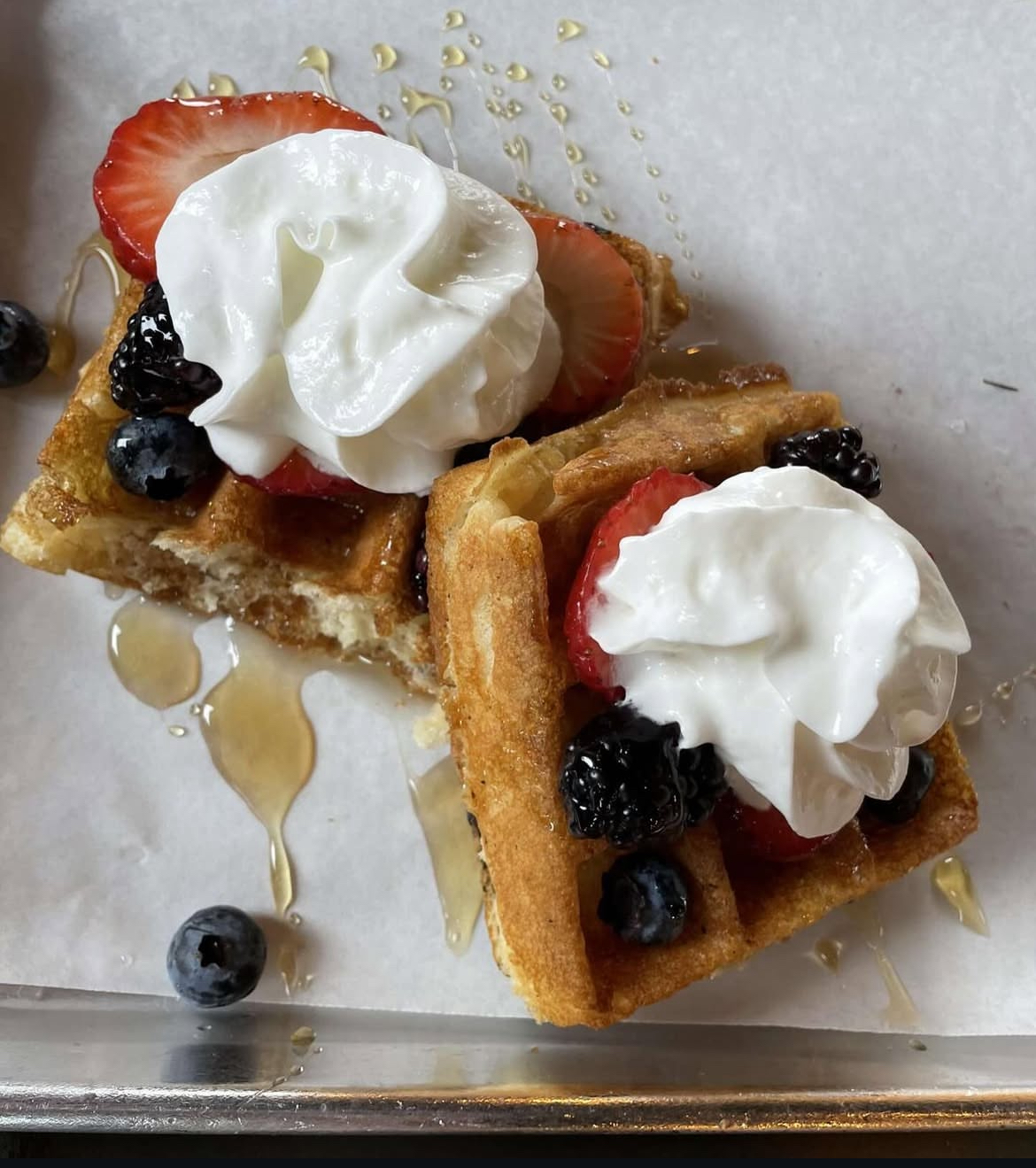 Berry Berry Berry Berry A fluffy sweet cream waffle topped with blueberries, blackberries, and strawberry slices! Honey and maple syrup are drizzled on top, and a dollop of whipped cream to finish!