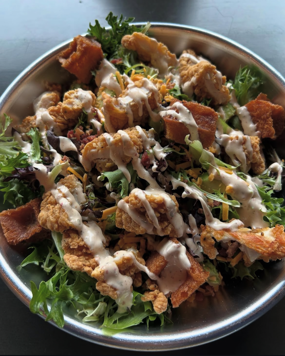 Chicken & Waffle Salad Chicken & Waffle Salad A hearty greens mix dressed with avocado slices, chicken slices, bacon bits, cheddar cheese, waffle crutons, and our chipotle ranch!