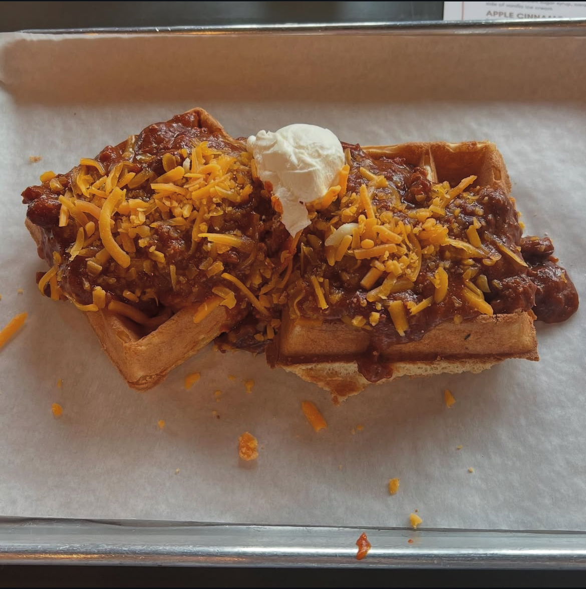 Chili & Cornbread Chili & Cornbread A rich cornbread waffle topped with our beef chili, shredded cheddar, and sour cream!