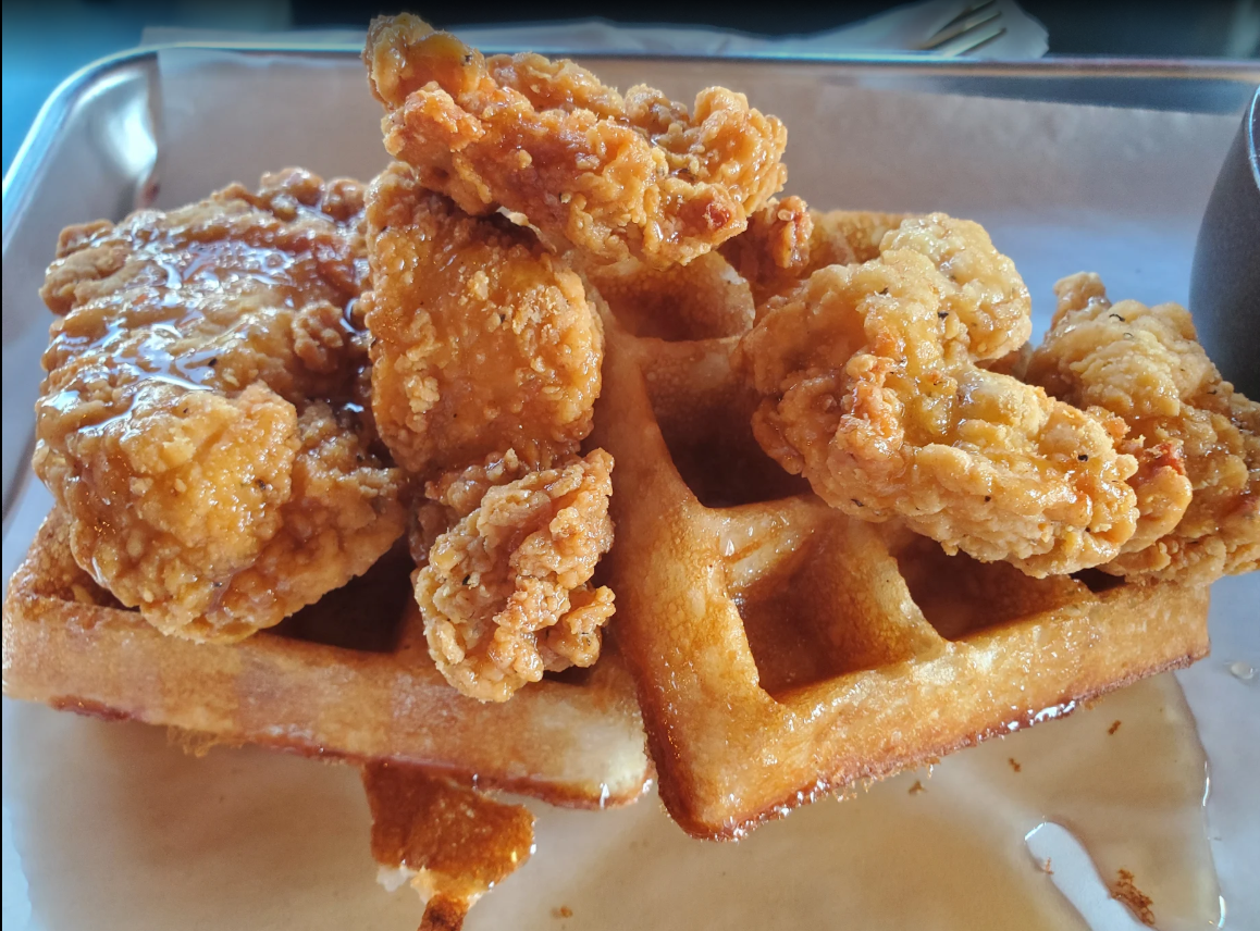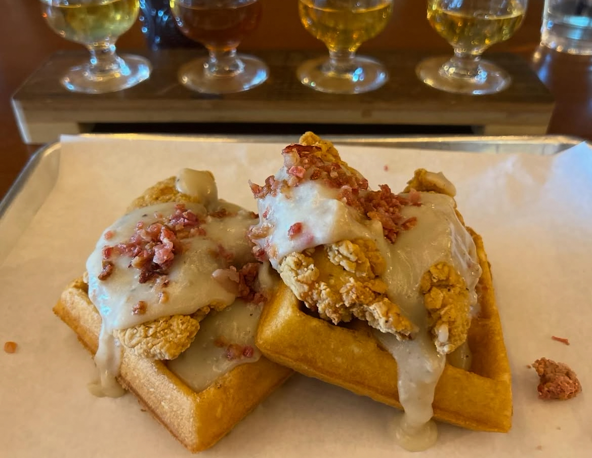 Chicken, Waffles, & Gravy Chicken, Waffles, and Gravy A classic Belgian waffle topped with crispy chicken and smothered with our sausage gravy! Bacon bits are sprinkled on top to round this waffle out!