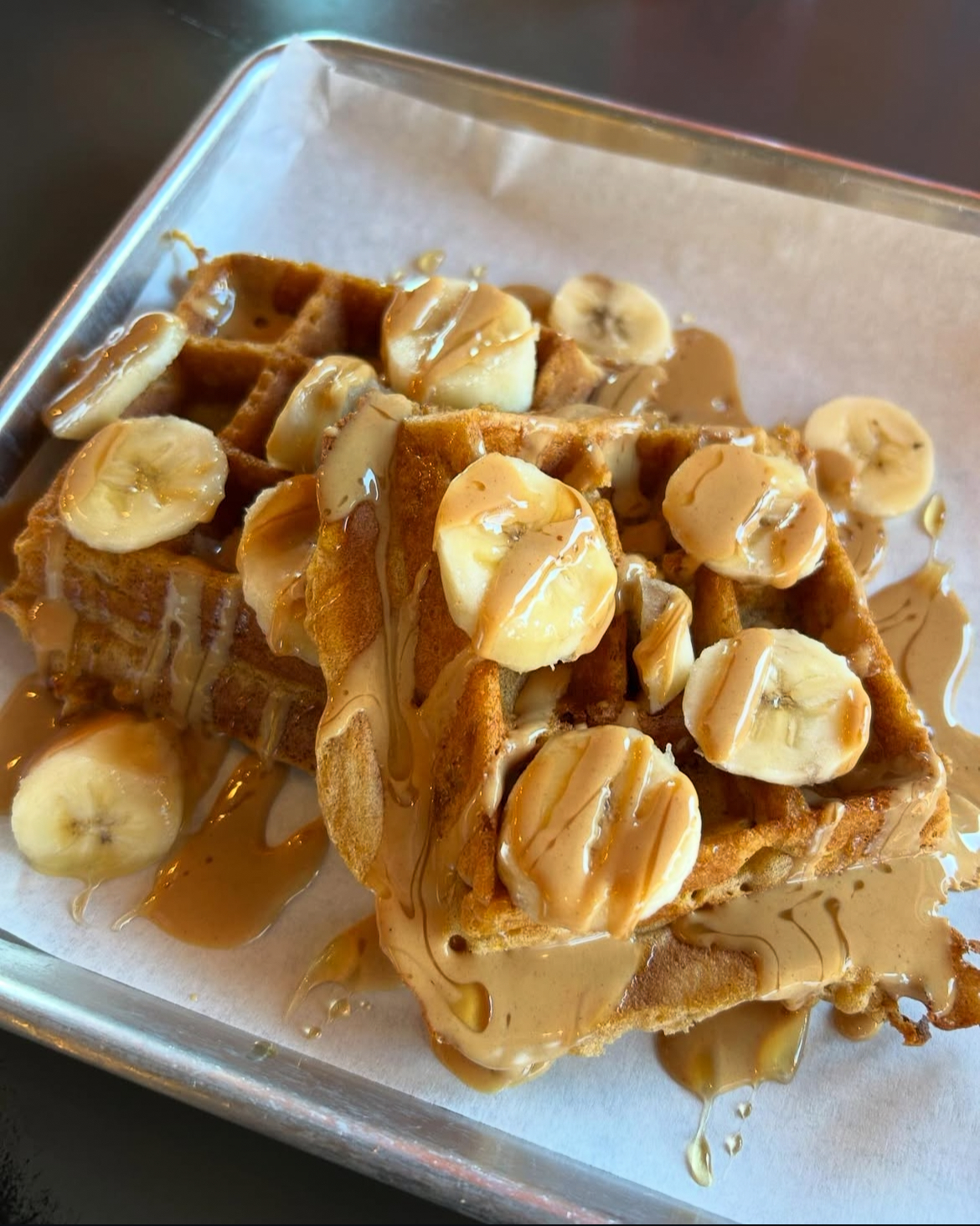 The Elvis The Elvis A fluffy sweet cream waffle topped with banana slices, melted peanut butter, and honey! Named after the king of rock and roll!