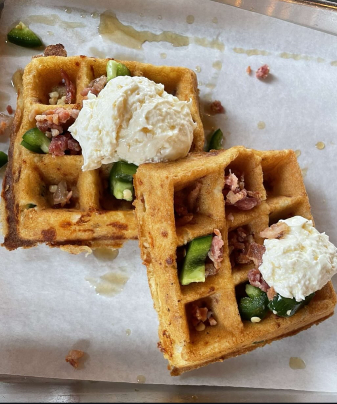 Jalapeno Popper Jalapeno Popper A rich cornbread waffle with jalapeno, bacon bits, and mozzarella mixed into the batter! Topped with brown sugar syrup, whipped cream cheese, jalapeno, and extra bacon bits!
