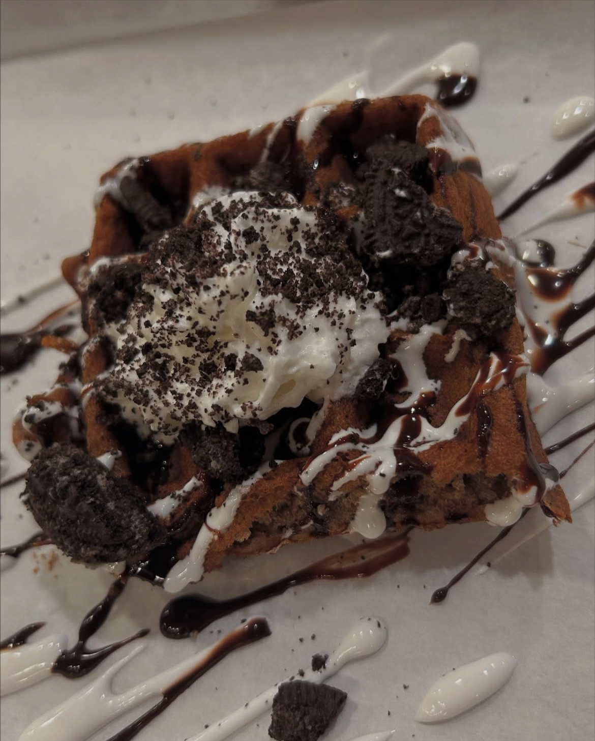 Oreo Delight Oreo Delight A sweet cream waffle mixed with rich chocolate syrup! Topped with oreo pieces, marshmallow syrup, chocolate syrup, and whipped cream!