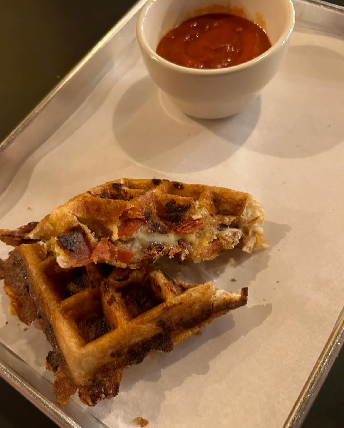 Pizza Pizza Pizza Pizza A classic Belgian waffle mixed with diced pepperoni and mozzarella, stuffed with whole pepperoni and extra mozzarella! Served with your choice of dip!