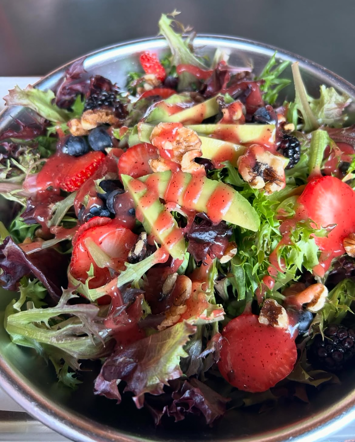 Waffle Salad Waffle Salad A hearty greens mix dressed with a berry assortment, walnuts, waffle crutons, and a sweet raspberry vinagrette!